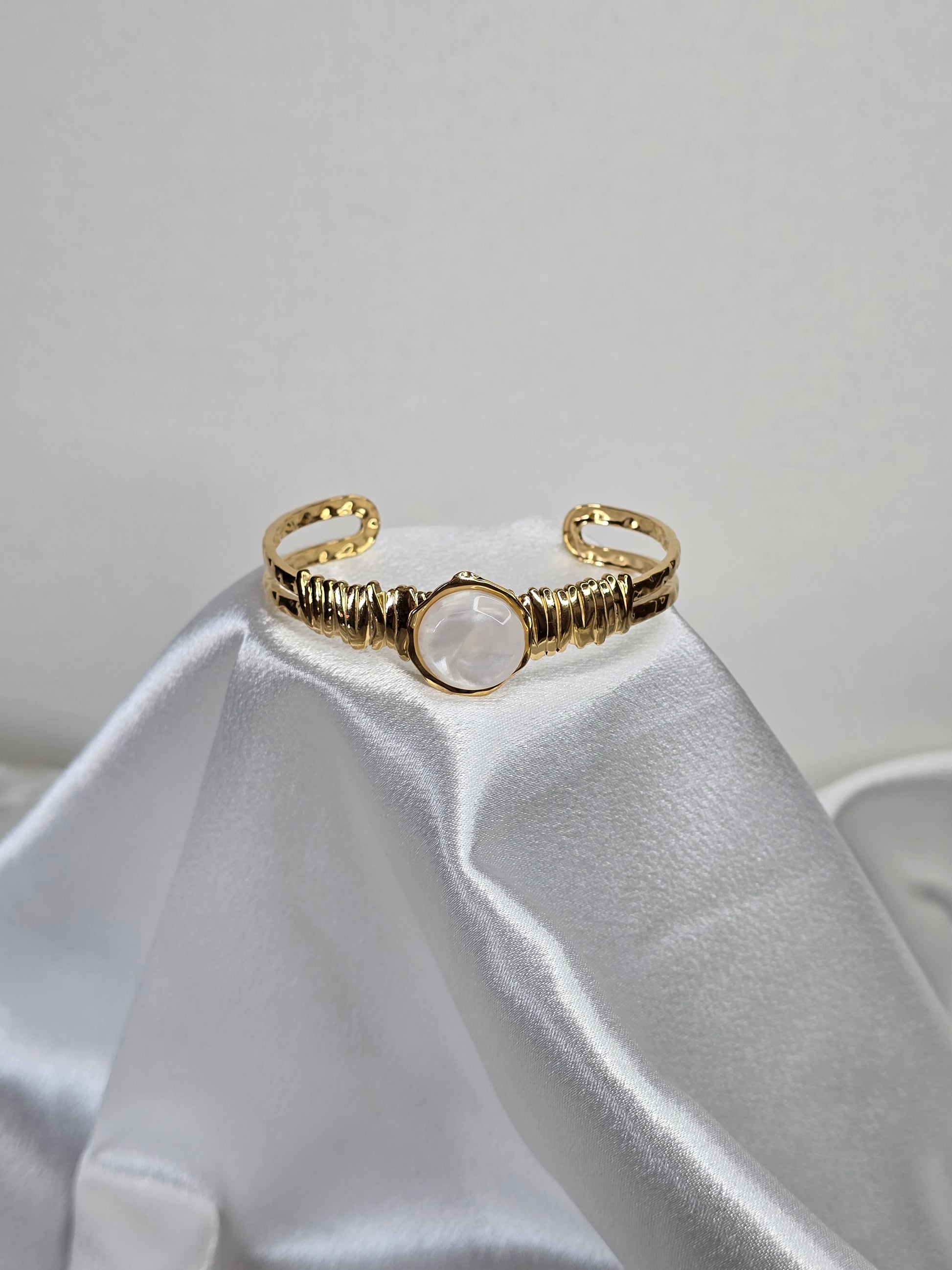 Bracelet jonc ouvert doré martelé avec pierre blanche nacrée